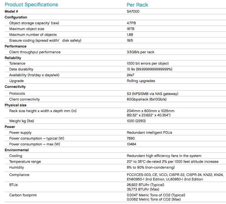 Die Laufwerke von HGST (Helium-Platten der zweiten Generation) sollen mit der hierfür optimierten Hardware und Software als „Scale- Out“ Objektspeichersystem eine Energieeffizienz von ca. einem Watt pro TB erreichen können (3 bis 5-fach niedriger als gängige Lösungen); der Listenpreis kann laut Anbieter sog. White-Box-Preise unterbieten; HGST beziffert die Gesamtbetriebskosten im Vergleich mit alternativen quelloffenen und auch kommerziellen Objektspeichersystemen um 50 bis 70 Prozent niedriger.