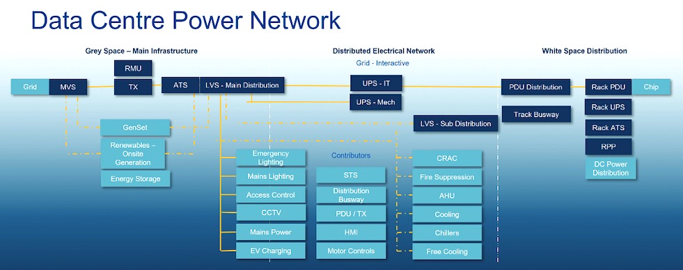 Elektrische Infrastrukturen in Rechenzentren müssen als Netzwerk konzipiert sein und als System funktionieren. Ein Rechenzentrum ist keine Sammlung von Funktionsblöcken, die einfach zusammengesteckt werden können. Stattdessen müssen alle Elemente so konzipiert sein, dass sie als End-to-End-System funktionieren. Dabei geht es nicht nur um Interoperabilität und Dimensionierung, sondern es muss auch sichergestellt werden, dass die spezifischen Systemparameter für Input/Output, Verwaltung und Betrieb im Voraus konzipiert und integriert werden.